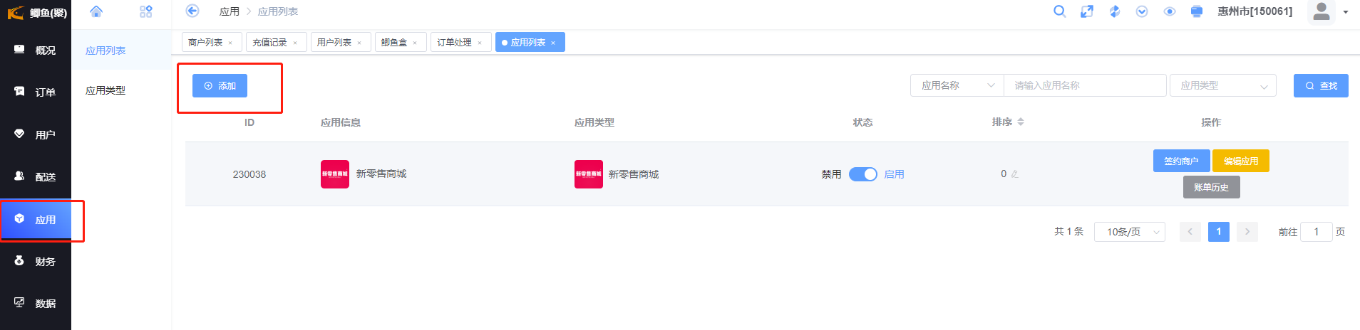 鲫鱼代理后台应用-应用列表那里添加一个“新零售商城”类型的应用。