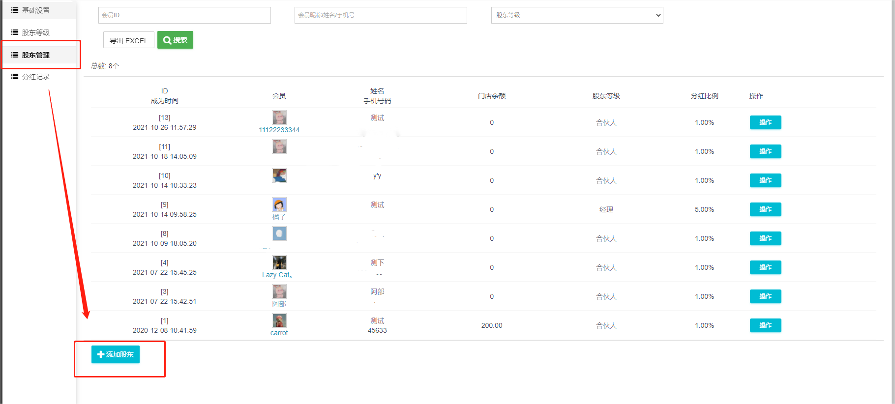 ③在该列表可查看到股东的id、成为时间、股东会员信息、股东等级、分红比例