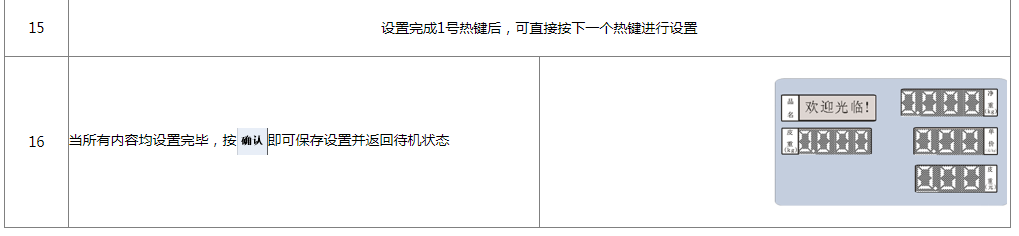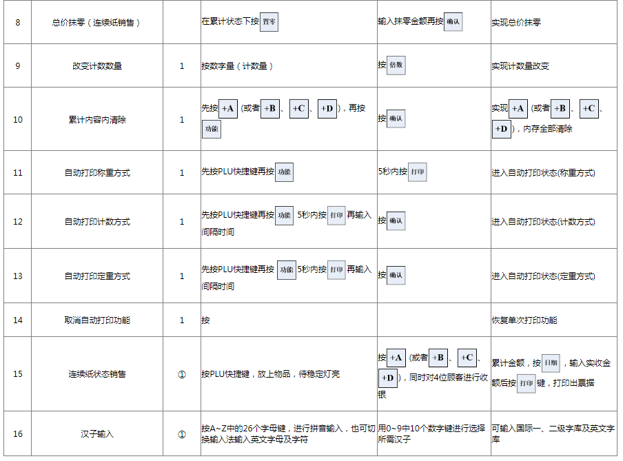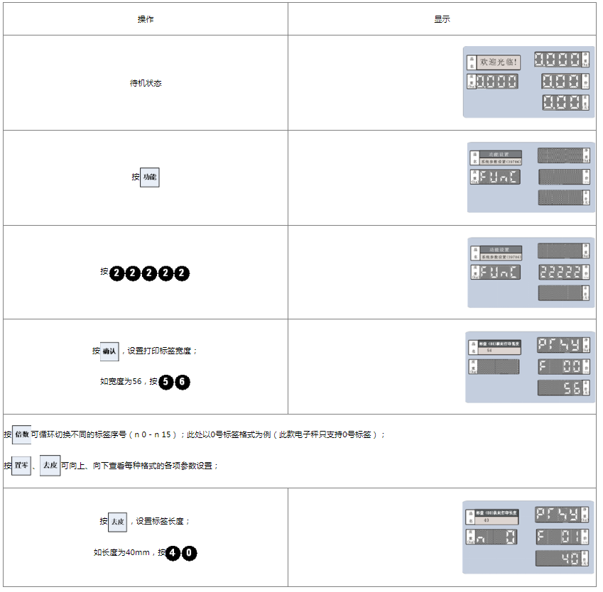 阅读本手册时,操作见表格最左列,表格其余列为实施最左列操作后条码打印计价秤各个窗口的显示内容;