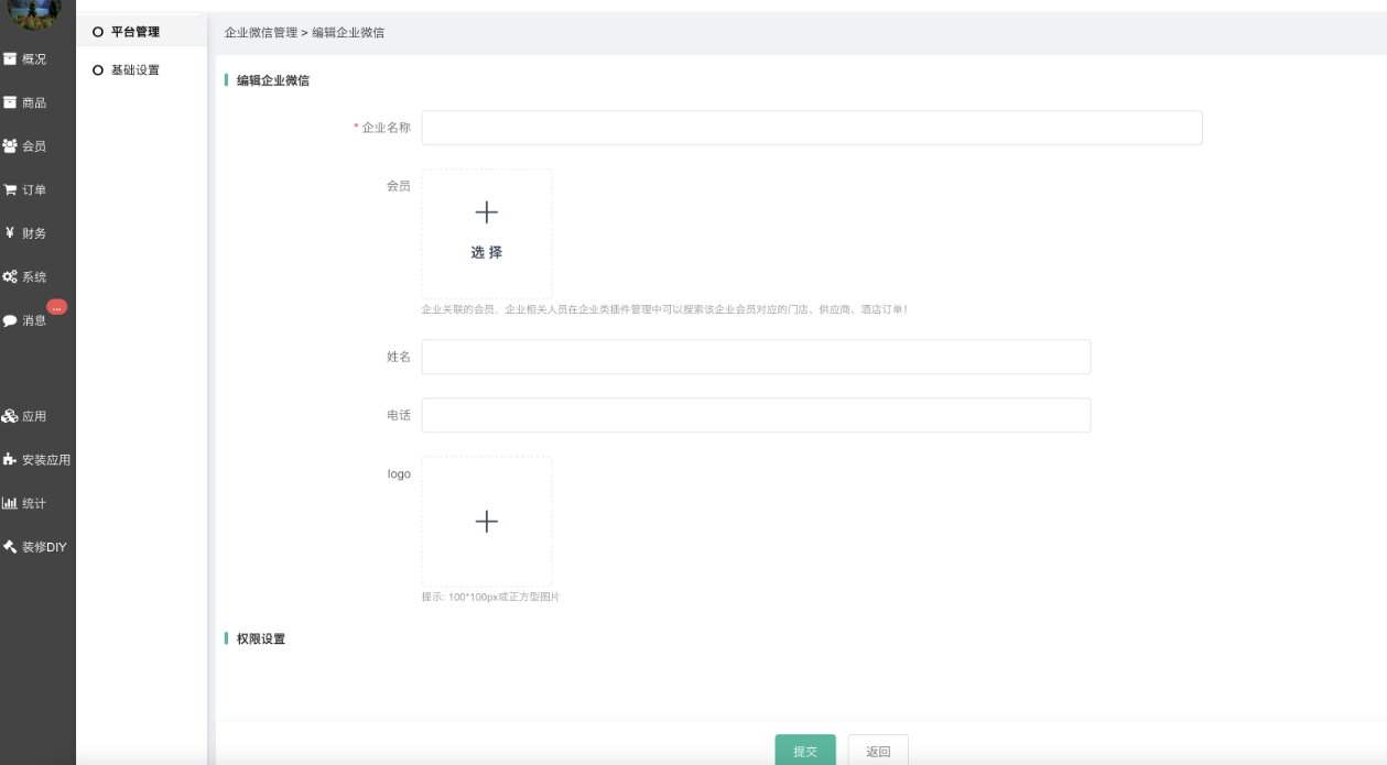 - 权限设置:可以单独设置该企业的应用权限,首次创建需提交后,在编辑才能进行设置。