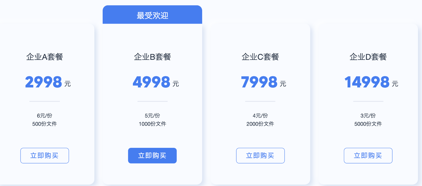 电子合同A套餐:包含300份电子合同,有效期1年,售价1500元;